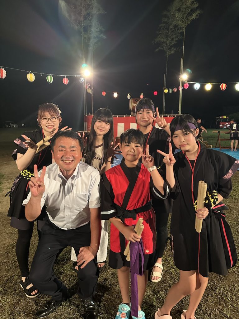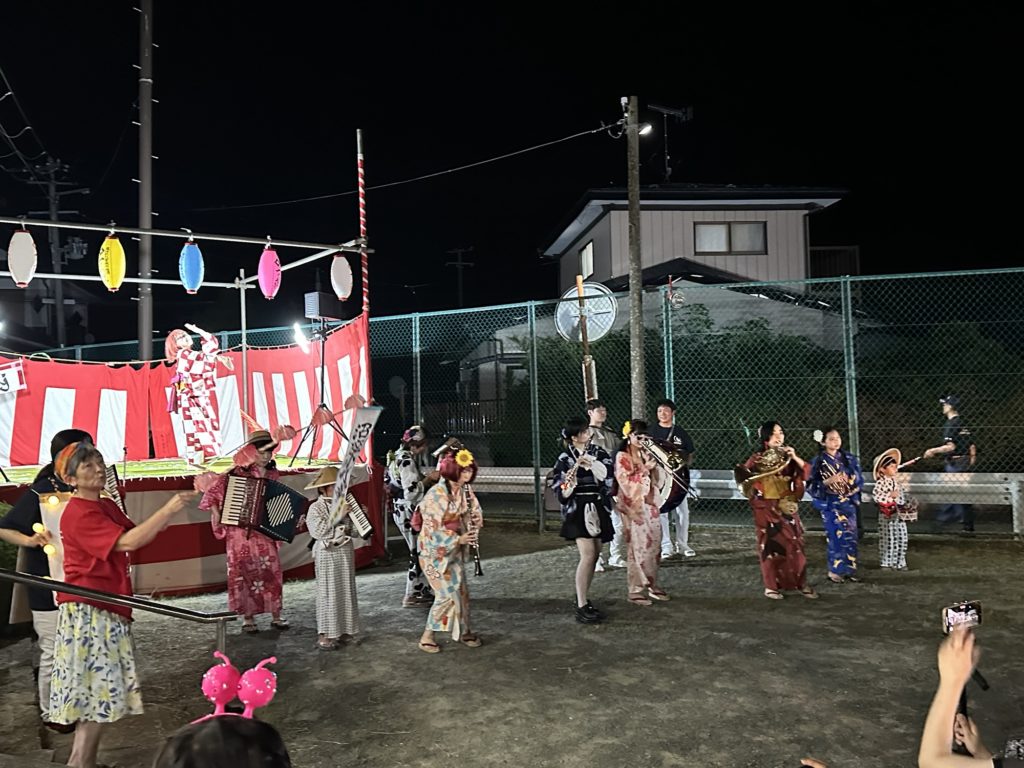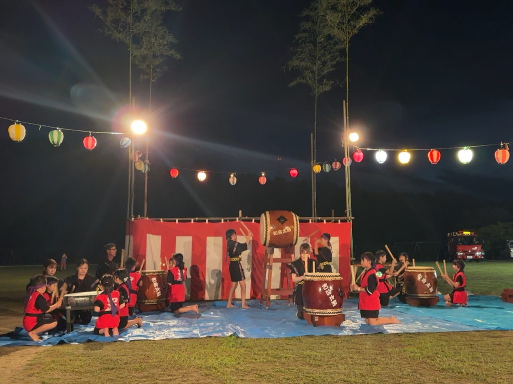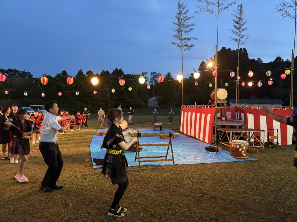 北小泉・下竹谷地区では和合太鼓の子ども達と一緒に盆踊り。夏なのに味噌おでんを美味しくいただきました。