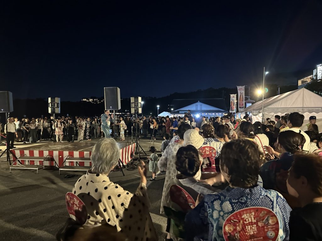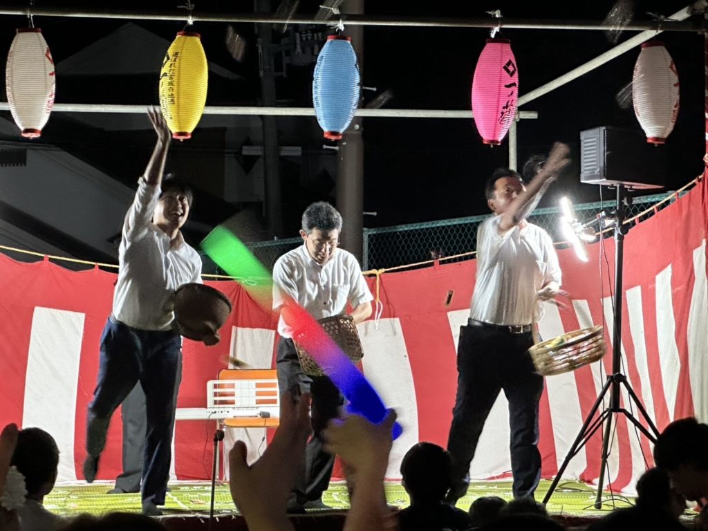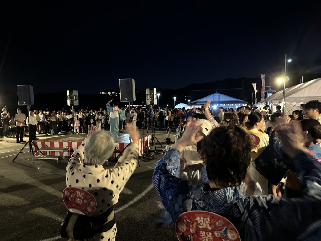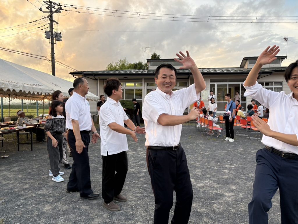 北小泉・下竹谷地区では和合太鼓の子ども達と一緒に盆踊り。夏なのに味噌おでんを美味しくいただきました。