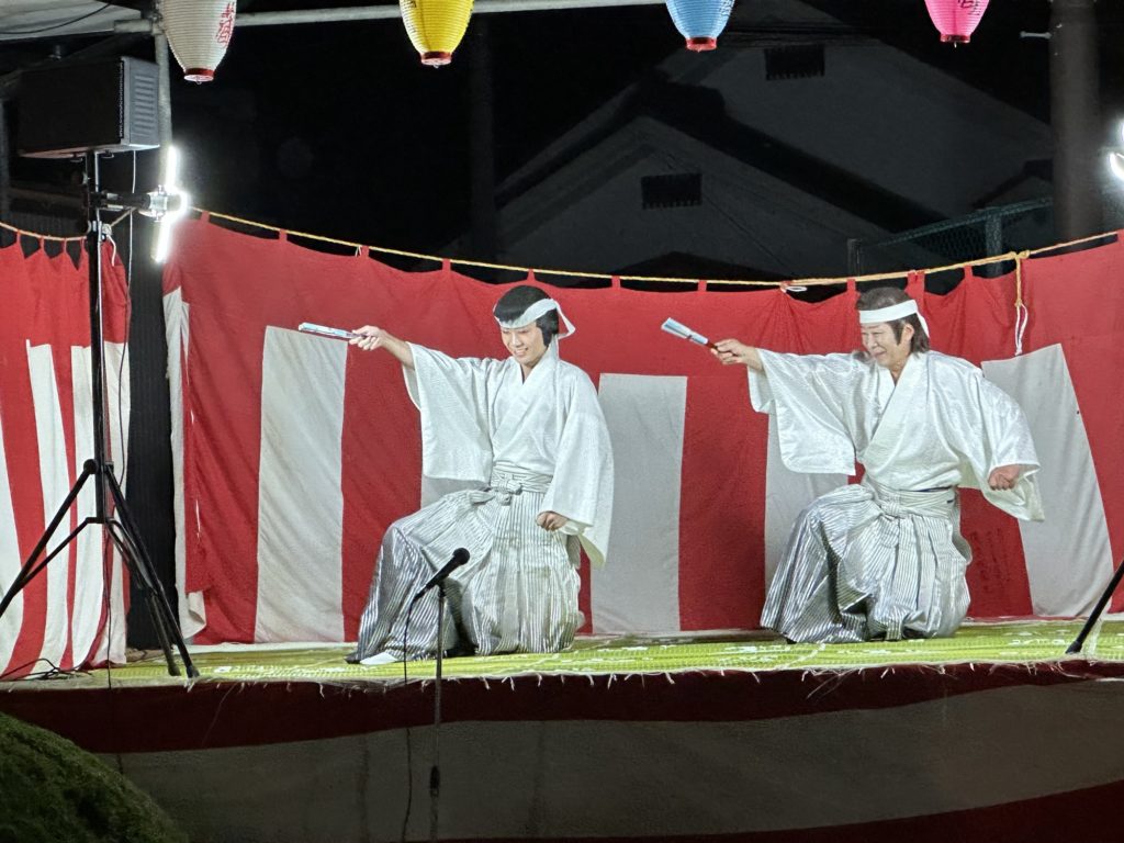 上竹谷では松島祭連竹谷舞の皆さんと一緒に盆踊り。股旅舞踊夢の会の高橋親子の華麗な演舞も行われました。