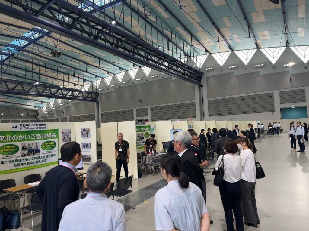 介護や水産加工など宮城県の企業120社と、インドネシアの送り出し機関が参加し、企業説明や採用などのマッチング事業が行われました。