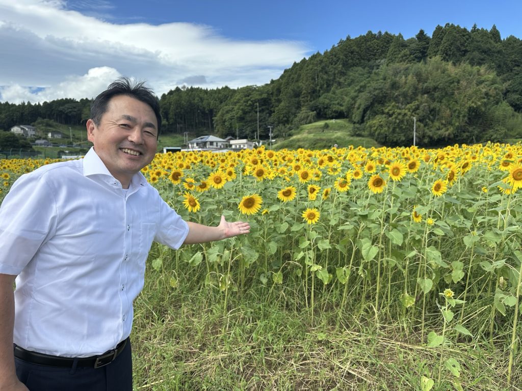 その後、「ねまわりのひまわりまつり」に参加し、1万本のひまわりが咲き誇る中、フルートとピアノが奏でる音を楽しみつつ、地域の方々と交流させていただきました。このイベントでは、長谷川会長が毎年お子さんにお菓子をプレゼントしており、子ども達が感謝を伝える場にほっこりしました。