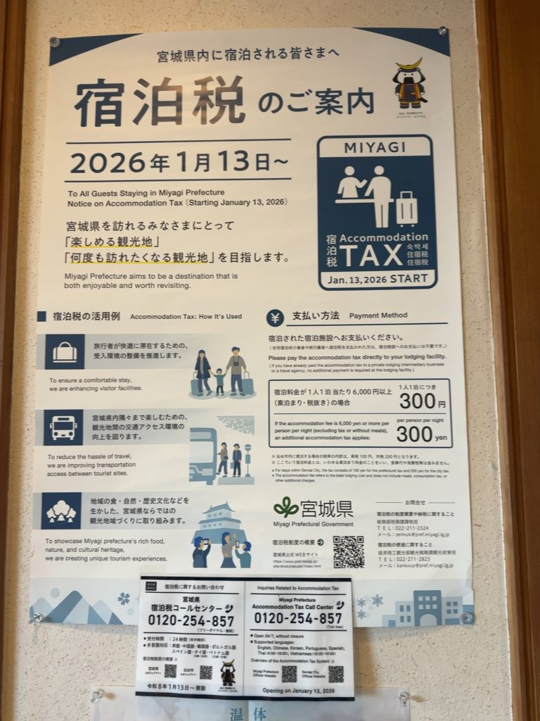 宮城県内の宿泊施設において宿泊税(300円)の課税が始まりました。