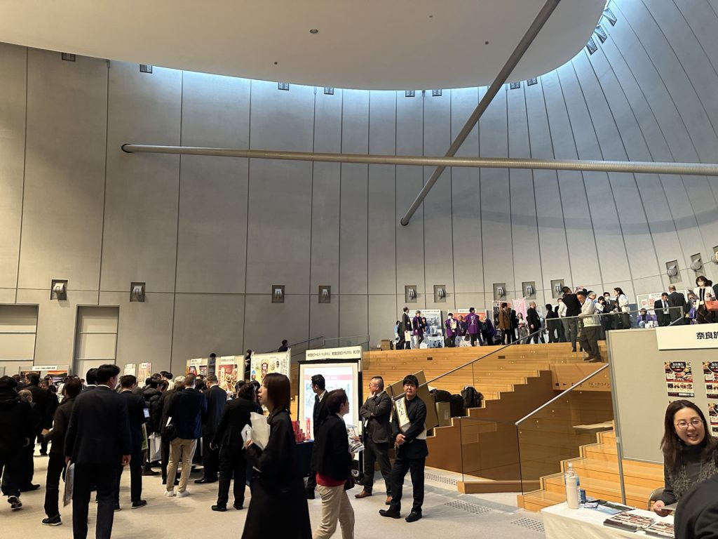 基調講演やパネルディスカッション、大学生による旅行企画の発表などが行われ、自治体や観光協会、各種事業者などの出展ブースには多くの方々で賑わっていました。そして、主催者である全国旅行業協会の副会長さんから、奈良県への送客10万人を目標とする提案がなされ、拍手をもって決定となりました。